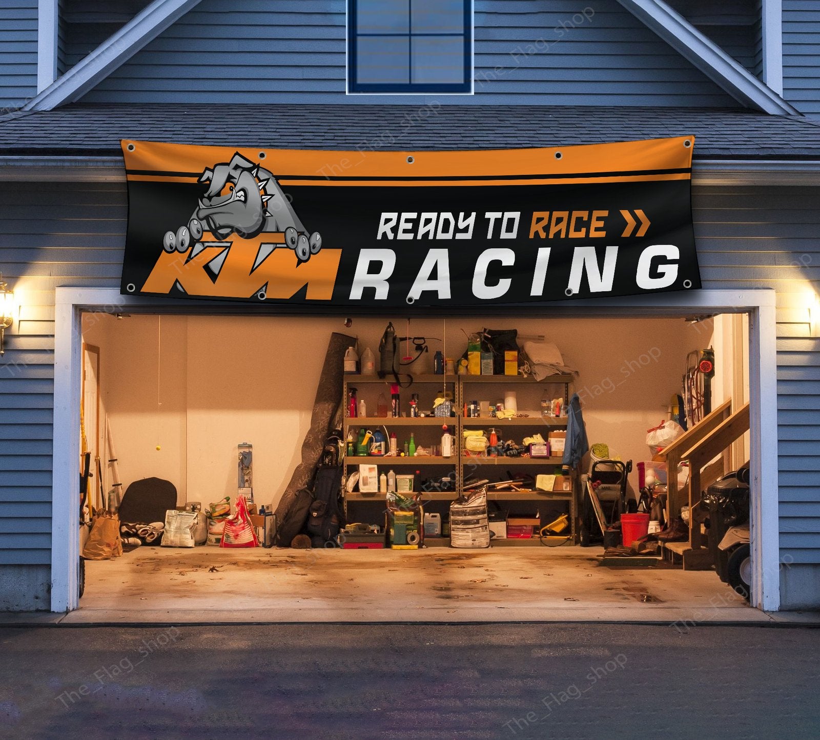"Gear up for adventure with this 2x8 ft KTM Racing 'Ready to Race' Banner Flag. Featuring the bold KTM logo and signature slogan, this high-quality banner is a must-have for motorcycle enthusiasts, racing fans, and off-road adventurers. Perfect for decorating your garage, man cave, or workshop, it adds a dynamic touch of KTM’s racing spirit. Made from durable, weather-resistant materials, this banner offers vibrant colors and lasting durability for both indoor and outdoor use. Whether you're a fan of KTM’s legendary motorcycles or motorsport heritage, this banner is an essential addition to your space."