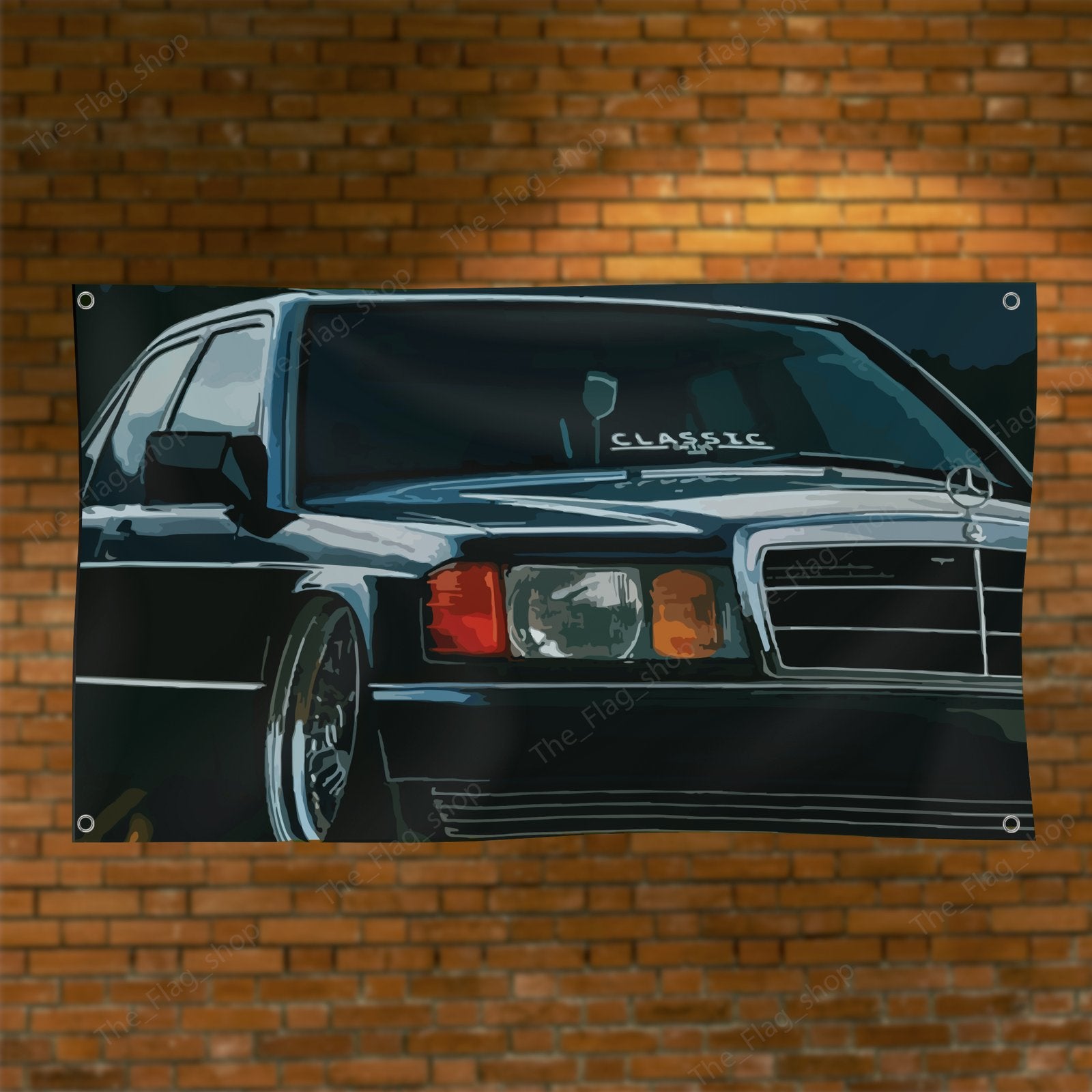 "Celebrate automotive history with this Mercedes-Benz 190E Photo Flag, measuring 3x5 ft. Featuring a stunning image of the iconic Mercedes-Benz 190E, this flag is a must-have for vintage car enthusiasts and collectors. Perfect for decorating your man cave, garage, or workshop, it brings a classic touch of Mercedes-Benz excellence to any space. Made from high-quality, weather-resistant materials, this banner ensures vibrant colors and durability for both indoor and outdoor use. Whether you're a fan of classic cars or motorsports, this Mercedes-Benz 190E photo flag makes a bold statement in your space, showcasing the legacy of one of the world’s finest automobile brands."